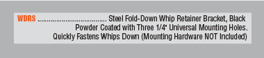 - Steel fold-down whip retainer bracket, black powder coated with three ¼” universal mounting holes. Quickly fastens whips down (mounting hardware NOT included).